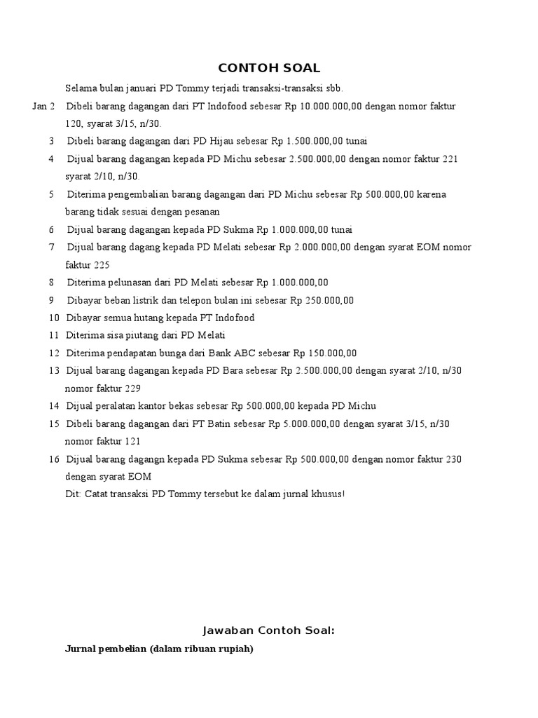 Contoh soal nya sebagai berikut: Kemal senilai rp5000.000 dengan syarat 2/10. 3 dibeli barang dagangan dari pd hijau sebesar rp 1.500.000,00 tunai 4 dijual barang dagangan. Contoh soal jurnal khusus perusahaan dagang page 2/7 Contoh soal dan latihan soal untuk jurnal khusus perusahaan dagang contoh soal selama bulan januari.